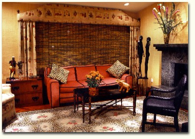 A primitive art collection gathered on trips abroad sets the theme for this den with its straw wallcovering, leopard pattern rug and throw pillows, and tonsu chest. The custom window valence is inspired by a Chinese pagoda.