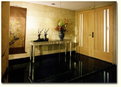 Black absolute granite flooring, a mirrored wall and a faux antique limestone wall transform a narrow, low-ceiling cinderblock entry.
