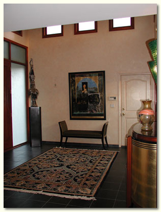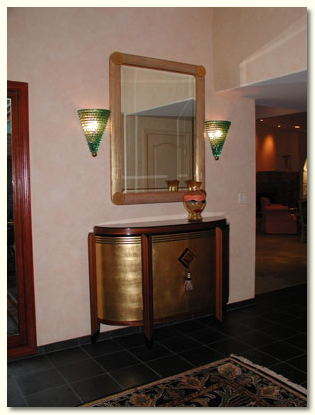 This double-height dramatic entrance with its honed black slate floors sets the tone for the sophisticated house that lies beyond. The walls are faux finished in a polished plaster soft peach color. The demilune cabinet is mahogany, ebony and gold leaf. The sconces are chipped glass.